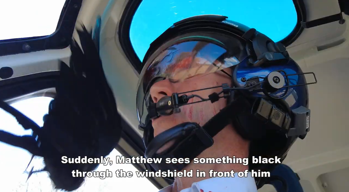 Un oiseau qui percute un pilote d’hélicoptère en plein vol. Extrait d'une vidéo de l'EASA (The Importance of Wearing Helmets when Flying a Helicopter)