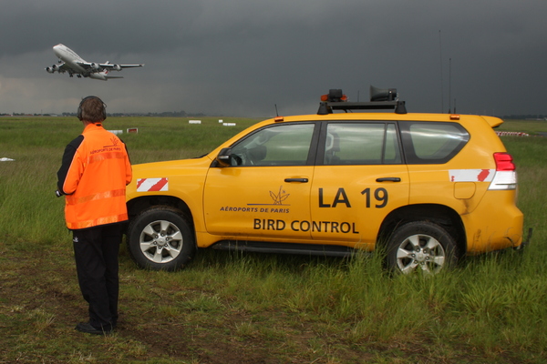 Des dispositifs utilisant des sons, des lumières clignotantes, ou des ballons effrayants sont placés autour des aéroports pour dissuader les oiseaux de s’approcher des zones à risque. Un personnel est très souvent déployé muni de canons à gaz ou des systèmes sonores qui imitent les cris de prédateurs pour effrayer les oiseaux. Ce sont "des effaroucheurs électroniques qui diffusent des cris de détresse d’oiseaux préenregistrés, des fusées détonantes, crépitantes ou sifflantes tirées depuis un pistolet propulseur".