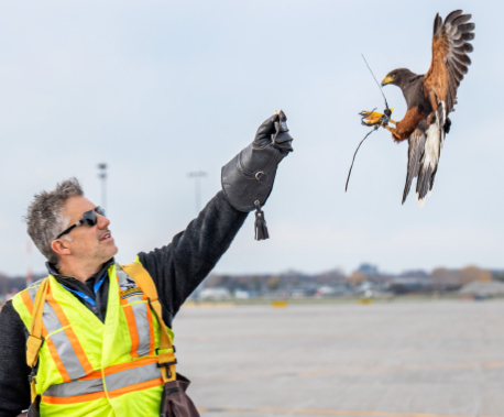 Certains aéroports utilisent des prédateurs naturels (comme des faucons ou des aigles) pour chasser les oiseaux de la zone autour des pistes. Ces prédateurs sont formés pour voler autour des aéroports et effrayer les oiseaux sans leur faire de mal.